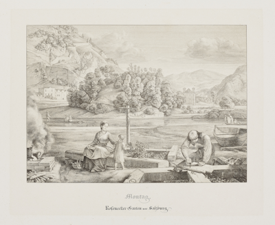 Ferdinand Olivier (German, 1785–1841), printed by Adolph Kunike (Austrian, 1777–1838), published by Ferdinand Olivier (German, 1785–1841), Monday: Rosenecker Garden outside Salzburg (Montag: Rosenecker Garten vor Salzburg), from the series Seven Places in Salzburg and Berchtesgaden (Sieben Gegenden aus Salzburg und Berchtesgaden), 1818–22, published 1823.