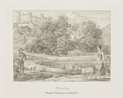 Ferdinand Olivier (German, 1785–1841), printed by Adolph Kunike (Austrian, 1777–1838), published by Ferdinand Olivier (German, 1785–1841), Tuesday: Salzburg Castle from the South (Dienstag. Bergvesste Salzburg von der Mittagsseite), from the series Seven Places in Salzburg and Berchtesgaden (Sieben Gegenden aus Salzburg und Berchtesgaden), 1818–22, published 1823.