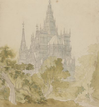 Karl Friedrich Schinkel (German, 1781–1841), A Gothic Cathedral behind Trees, 1810/15.