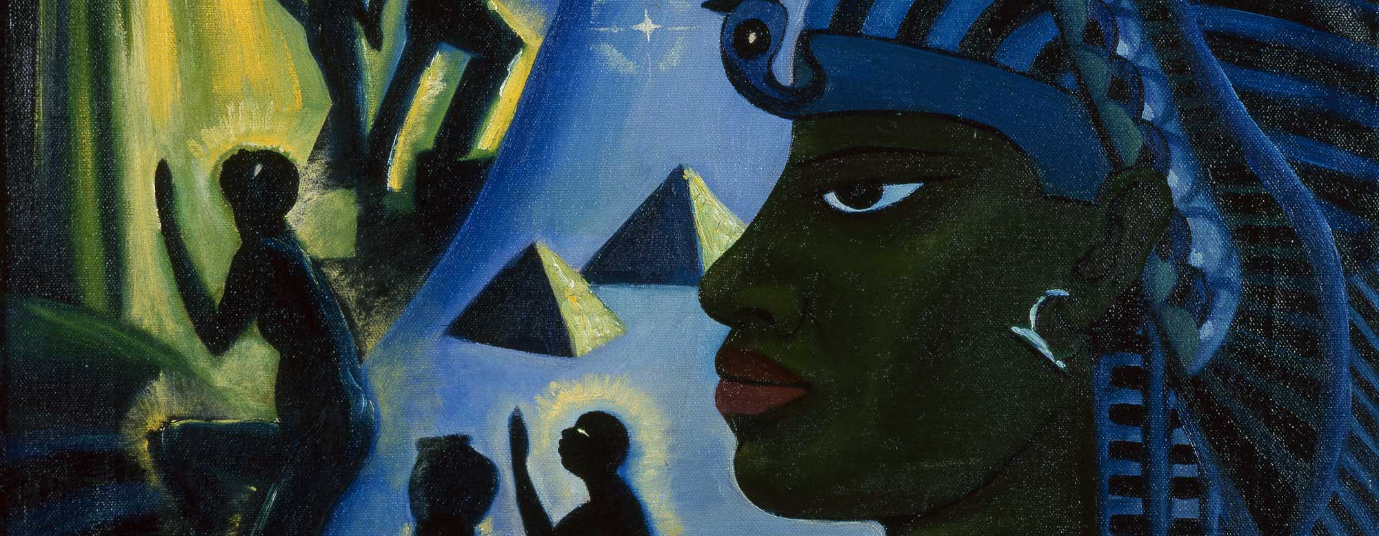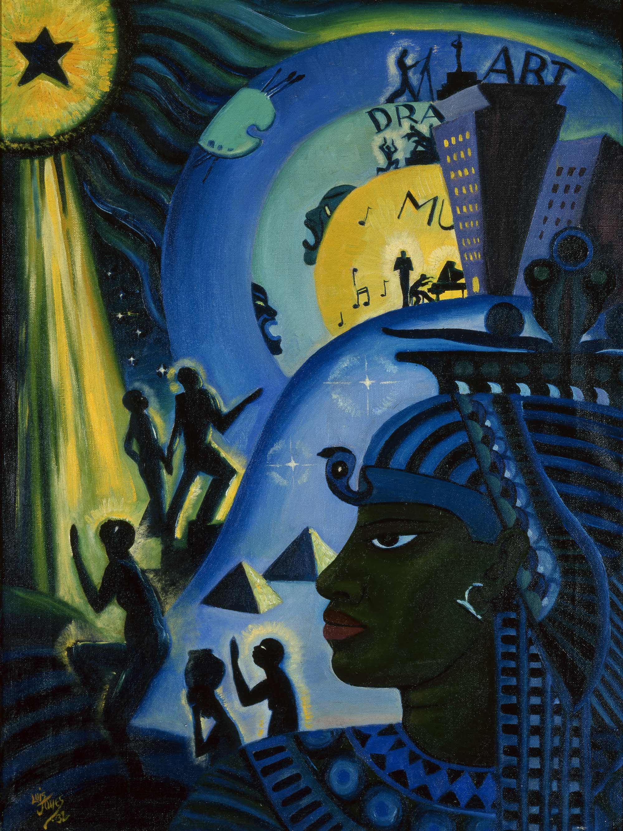 In The Ascent of Ethiopia, from a majestic pharaoh, silhouetted figures rise from pyramids at the base of the painting and climb toward a cityscape, where Black creativity—a triad of art, drama, and music—flourishes. Jones’s composition links people of African descent with their historical past and cultural present through rich color, geometry, and iconography that suggest the rhythms and improvisation of the Jazz Age.