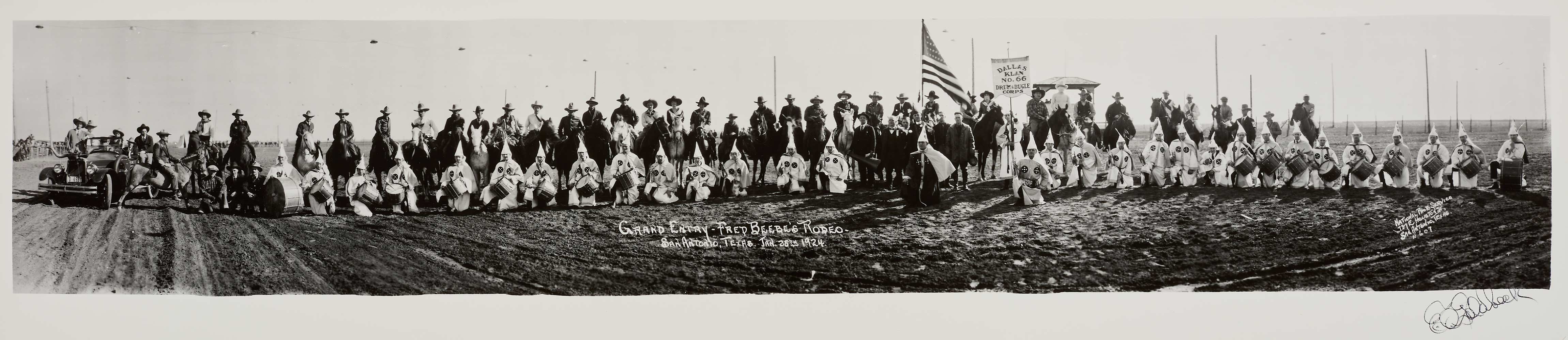 This particular rodeo was a popular touring rodeo billed as the “World Series” of such events; it was presented by Fred Beebe, a horse wrangler and member of the State Mounted Police in New Mexico. During the 1920s, partly motivated by African Americans moving to northern cities (the Great Migration), renewed interest in the country’s colonial past, and popular attention through films such as Birth of a Nation (1915), the KKK launched a massive, countrywide recruiting campaign. Klan membership ballooned, with national estimates of around three to eight million members. The KKK was so entrenched in Texas civic life that seeing the Klansmen featured so prominently at this popular event, while alarming, is not surprising. The KKK, in fact, heavily promoted the event in the pages of its newspaper The American Forum, and it was Dallas city officials who paid for a special train to send the Dallas chapter to San Antonio.
