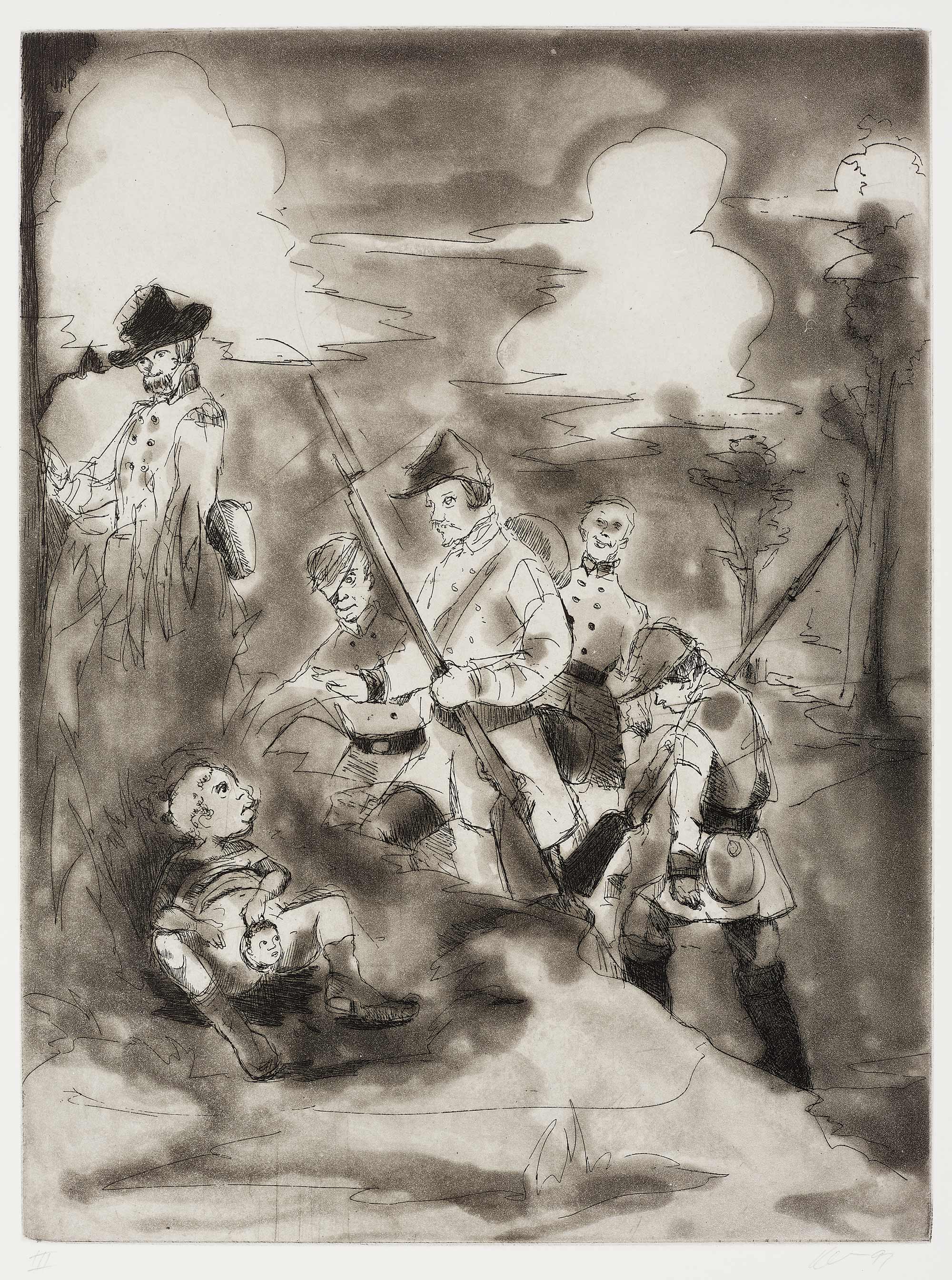Kara Walker’s Li’l Patch of Woods depicts Civil War soldiers crossing paths with a Black child giving birth to a baby in a small forest. The child, who makes eye contact with the soldiers, spreads her genitalia open for the men to witness her infant peering out from between her legs. Untitled depicts a bare-chested white man (in this case, the nineteenth-century abolitionist and religious zealot John Brown) with a noose wrapped around his neck. As a soldier observes in the background, a Black woman lifts an infant’s genitalia to the man’s lips while simultaneously stepping down on a white child. Walker’s two prints reimagine grotesque, open-ended scenarios rooted in racist American mythology and confront us with the violence, molestation, and racial terrorism that generations of enslaved and emancipated Black and African American populations have experienced.