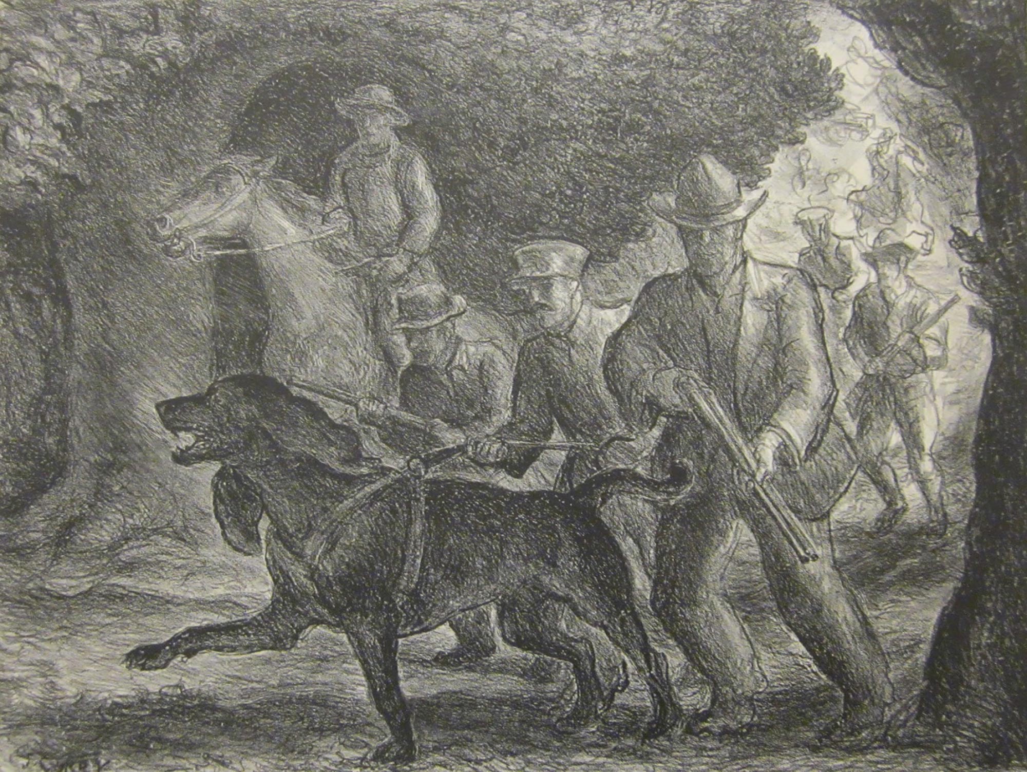Orozco created this work for the portfolio American Scene No. 1: A Comment upon American Life by America’s Leading Artists. For the second American Scene portfolio, American artist John Steuart Curry produced a lithograph titled Manhunt (also in the Museum’s collection), which depicts a lynch mob hunting its prey. (See a picture of this work below.) The image hearkens back to Orozco’s gruesome scene, providing what could be the precursor to The Lynching’s tragic end.