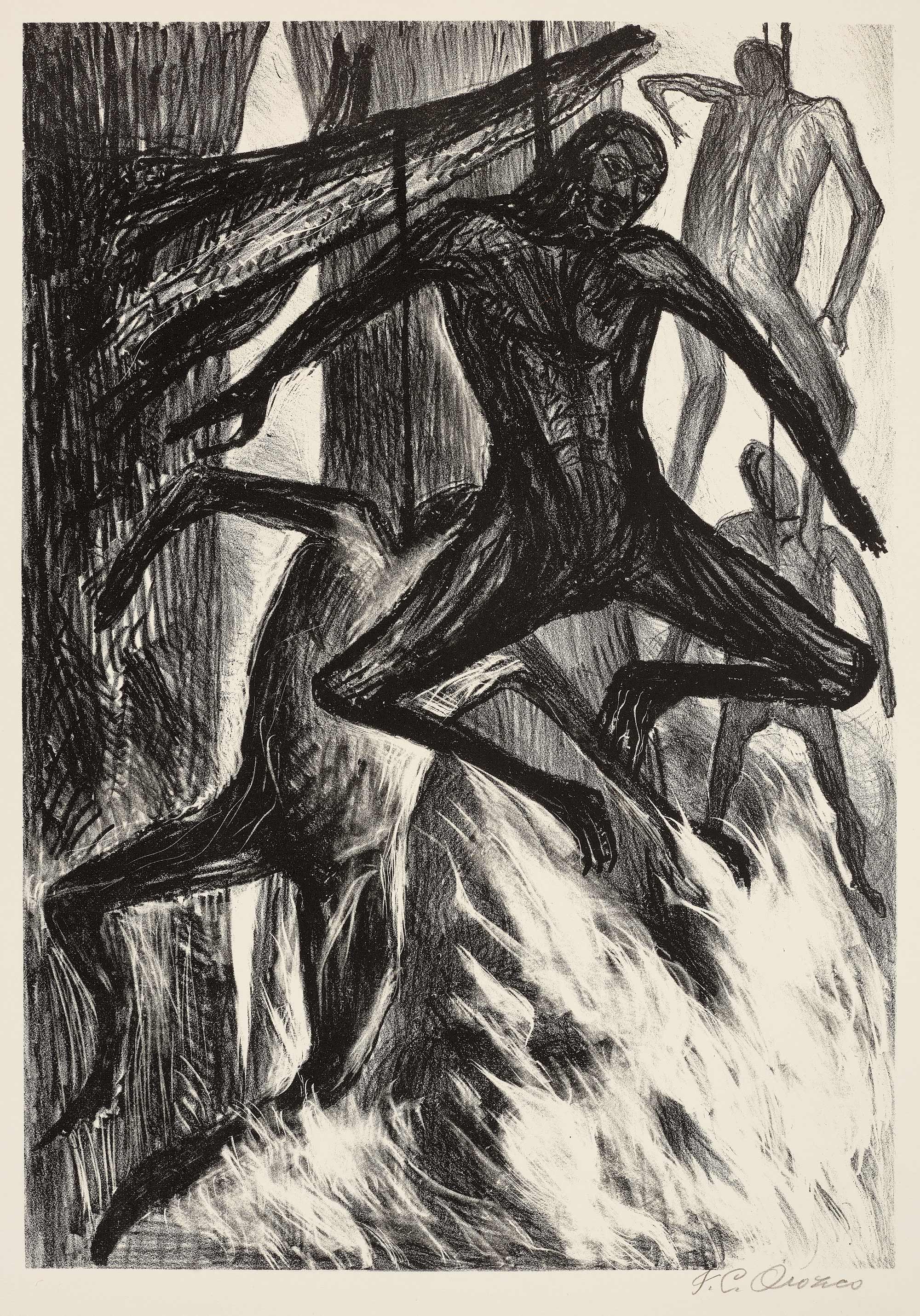 José Clemente Orozco’s lithograph depicts a mass lynching event. Four burnt corpses dangle from the branches of leafless trees as a violent white fire rages beneath the contorted bodies. These bodies are nameless; their faces, smashed in and erased. White supremacists slashed their lives for having Black skin.