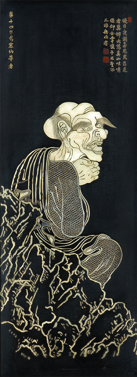 A visually arresting, monumental jade and lacquer screen depicts each of sixteen luohan, or enlightened beings—the celebrated disciples of the Buddha—in a surprisingly grotesque manner, after an earlier painting by a master who saw them appear this way in a dream. The reverse side of the screen, long hidden from view due to its orientation flush with a chamber wall, is equally striking, with glorious botanical images painted in gold (shown left).