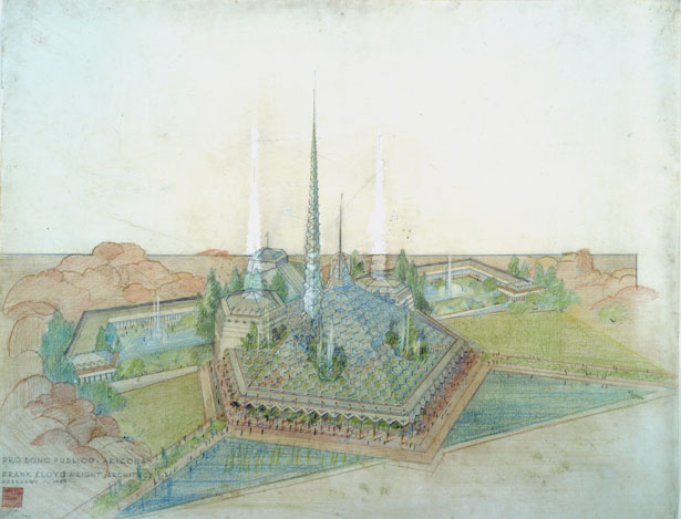 - Arizona State Capitol, “Oasis,” Phoenix, AZ, 1957 (project), Air View, © 2010 Frank Lloyd Wright Foundation, Scottsdale, AZ.
