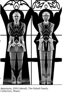 Gilbert & George place themselves, their thoughts, and their feelings at the center of their art, and almost all of the images they use are gathered in the half-mile or so surrounding their home in London’s East End. Yet their pictures capture a far broader human experience, encompassing an astonishing range of emotions and themes, from rural idylls to gritty images of a decaying London; from fantastical, brightly colored panoramas to raw examinations of humanity stripped bare; from sex advertisements to religious fundamentalism.