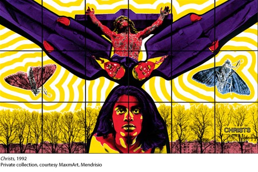 After a period in the 1980s when, significantly, figures other than the artists began to appear, Gilbert & George once again began to take center stage in their pictures. They continued occasionally to depict other people, but they had clearly shifted away from the large ensemble pictures, which included a cast of young man—living embodiments of potency and strength—that often aroused considerable hostility among critics. This growing focus on themselves may reflect their sense of isolation after the death of so many friends from AIDS. The use of garishly clashing colors in these pictures was deliberately anti-aesthetic, while their depiction of themselves was often gleefully grotesque. In Christs, their bodies form the two arms of the cross while they stick out their tongues.