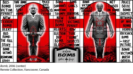 Gilbert & George’s most recent pictures were made especially for this exhibition. The monumental Bomb represents London in a new age of terror. Each panel reproduces a headline board advertising the Evening Standard newspaper, which the artists have collected over the last year or so. As an evening paper, the Standard is regularly sold on the street and outside tube stations, and its headlines grab the eye of every passerby, becoming part of the visual fabric of the city that has so consistently fascinated the artists. The headlines are arranged according to key words, such as “terror,” “bomber,” or “bomb,” providing a lexicon for our contemporary fears and anxieties. The mirrored faces of the artists seem to embody the queasy anxiety that pervades life in the wake of the London bombs of July 2005. The pictures are marked with other disconcerting details, such as the seeds from London plane trees, which resemble bomblets.