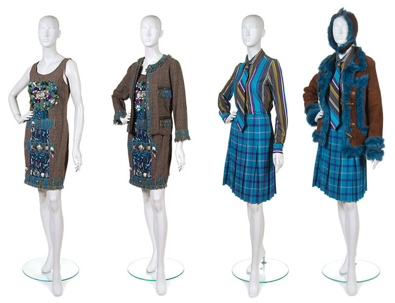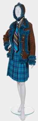 5 pieces: Coat, blouse with tie, skirt and hat; Brown suede hat with blue fur lining; Brown suede coat with blue fur lining, blue fur cuffs, toggle closure, pockets; Striped blouse with button closure, cuffs and matching tie; Plaid wool pleated skirt, unlined, blue chainmail sewn on top of waist facing.