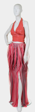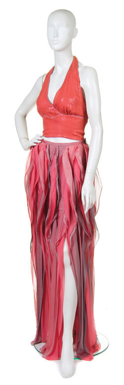 2 pieces: halter top and long skirt; Coral sequin silk halter top with yoke; Coral and gray silk chiffon paneled skirt with slits, short nude lining.