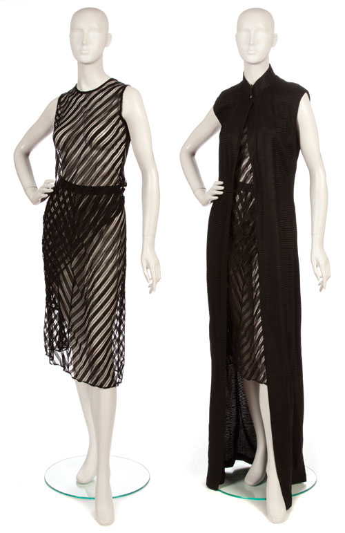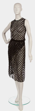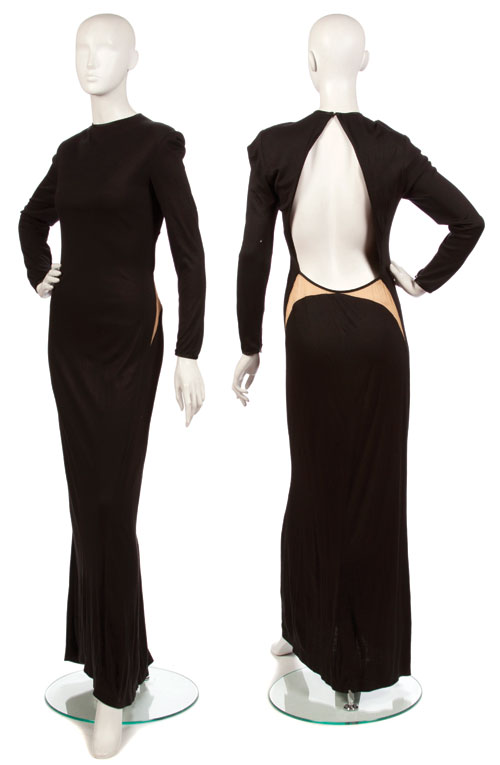 Black knit jersey long sleeve, evening dress with nude silk inserts and black silk binding.