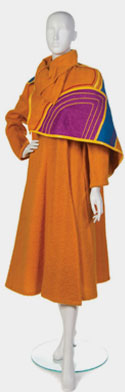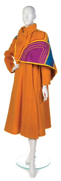 Orange wool coat with removable quilted shawl/collar; Multi color quilted shawl with leather binding and two buttons; Mid-calf length orange wool coat with shoulder button and snap closures, pockets and convertible collar.