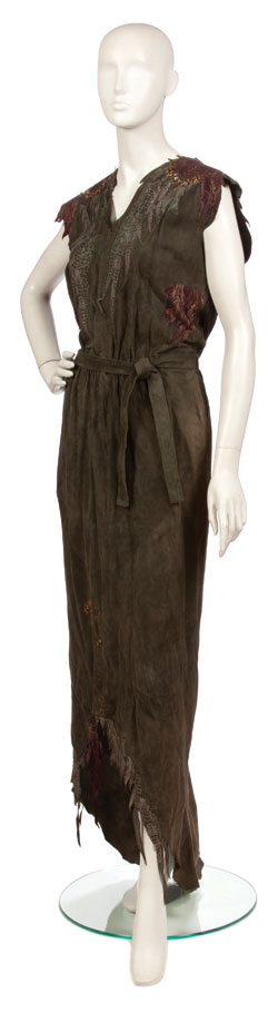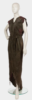 Sleeveless long suede dress, feather applique and tie belt; 3 small feathers at bottom center front.