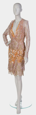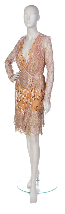 Two piece: jacket, dress, skirt slip; Pink and gold lace jacket with v-neck and button closure; Coral and gold silk devore wrap dress with side button clpsure and lace trim at hem; Pink and gold lace slip skirt with side zipper.