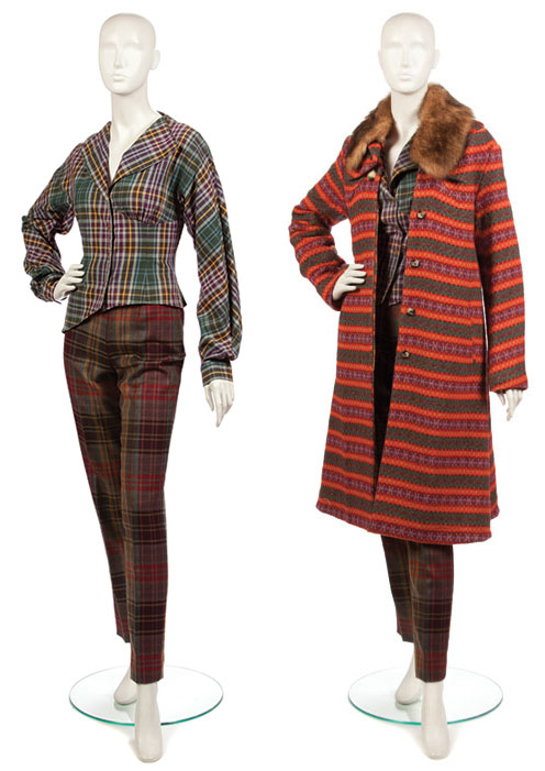 3 piece: coat blouse, pant; Multi color coat had detachable fur collar, hidden button closure, side vents; Plaid button up blouse with lapel, pieced seaming, dolman sleeves; Plaid wool pant, side zipper, no lining.