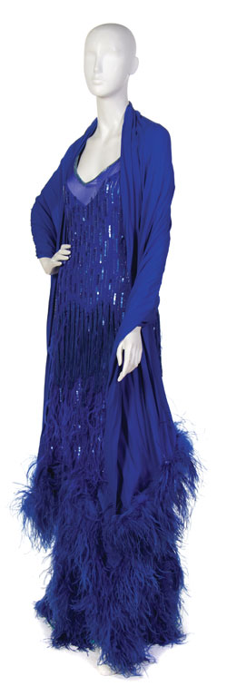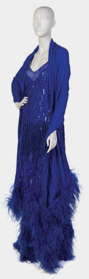 Three piece: slip, dress, shawl/wrap; Blue chiffon shawl, blue feather trim at each end; Blue silk slip with back zipper, feathers at hem; Sleeveless blue heavy beaded shift dress, floor length, fringe trim and feathers near hem, back zipper.
