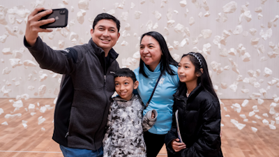Background video description: Various vignettes of the Milwaukee Art Museum campus experience show what it’s like to visit and what guests can expect to see throughout the space—from the white, modern Calatrava building facing Lake Michigan, a child eagerly running toward the entrance off of the Reiman Bridge, and a guest taking in the expanse of Windover Hall to a group of friends enjoying the East Lawn off Oak Leaf Trail, a parent and a child enjoying art in a gallery together, and children painting under a teacher’s instruction at Kohl’s art studio.