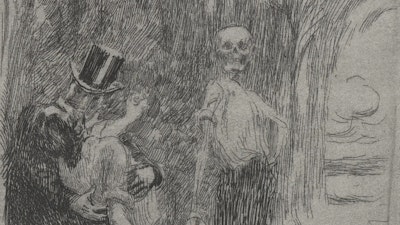 During the 19th century, advancements in industry, science, and technology changed how people thought about and dealt with death. In response, some European artists reimagined a motif known as the dance of death, which historically featured skeletons gleefully clinging to people from all walks of life. This exhibition highlights two portfolios from the Museum’s collection by Albert Besnard (French, 1849–1936) and Max Klinger (German, 1857–1920). Both artists represented death disrupting everyday moments, emphasizing how sudden and unpredictable it could be. The 20 prints convey public anxiety related to previously unknown or more industrial causes of death. By looking to and updating traditions, Besnard and Klinger found a way to cope with the complex world around them.