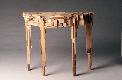 One of the most innovative artists working in North America today happens to be a woodworker. Toronto’s Gord Peteran has launched a boundary-crossing career, opening up the category of furniture to an unprecedented range of psychological and conceptual content. Sometimes his means are disarmingly simple: His work A Table Made of Wood is cobbled together, seemingly at random, from scraps lying on his workshop floor. At other times, he employs craftsmanship of the highest order, as in 100, a precisely machined occasional table that disassembles into a carrying case like that used for a rifle. Other works suggest specimen cabinets, seesaws, and game tables, all twisted into new relevance through subtle manipulation. In all cases, Peteran's work addresses the specific conditions of furniture even as it subverts those conditions.