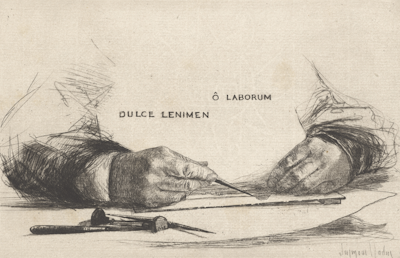 Seymour Haden, Hands Etching–Ô Laborum, published on the title page of the book Etching Studies (Etudes á ’eau forte), 1865.